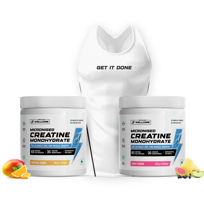 Wellcore - Micronised Creatine Monohydrate (83 Servings, Tropical Tango) + Creatine (83 Servings, Fruit Fusion) + Premium Gym Vest